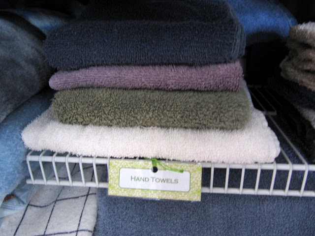 I attached labels for the towels and linens by hole punching the label and tying the label onto the shelf with green ribbon. Now we can easily tell the difference between the double and queen size linen.