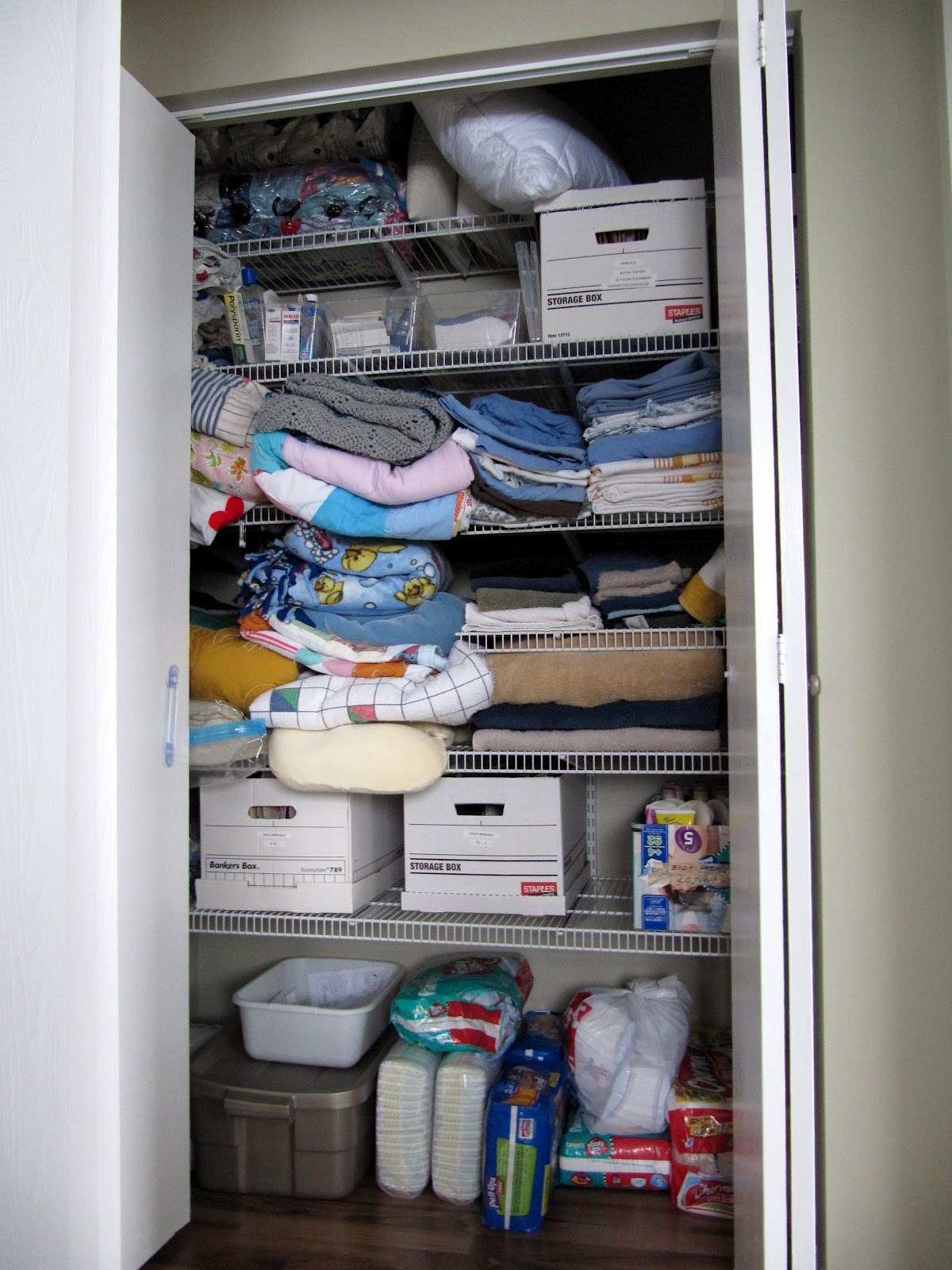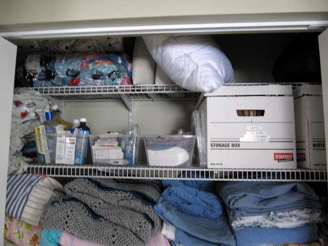 Not very pretty, I know! This closet is nearest to the bathroom. We don't have a closet in the bathroom so all the bathroom linens and supplies go in this closet. I also keep our extra pillows, bed linens, and blankets in this closet. I keep manuals and warranty information for our electronics, tools, and such in white banker's boxes. Currently, I have 4 of these boxes full!