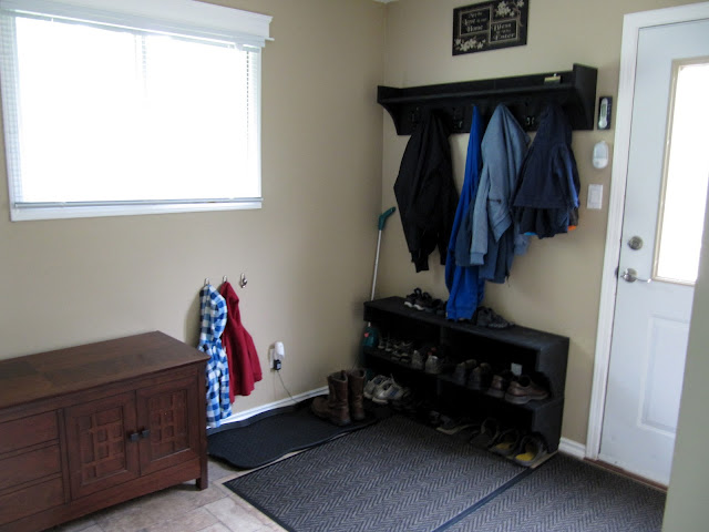 My husband built the shoe and hat racks from plywood and we stained the racks black. The dark color hides most of the dirt that falls off the shoes until the racks get cleaned.