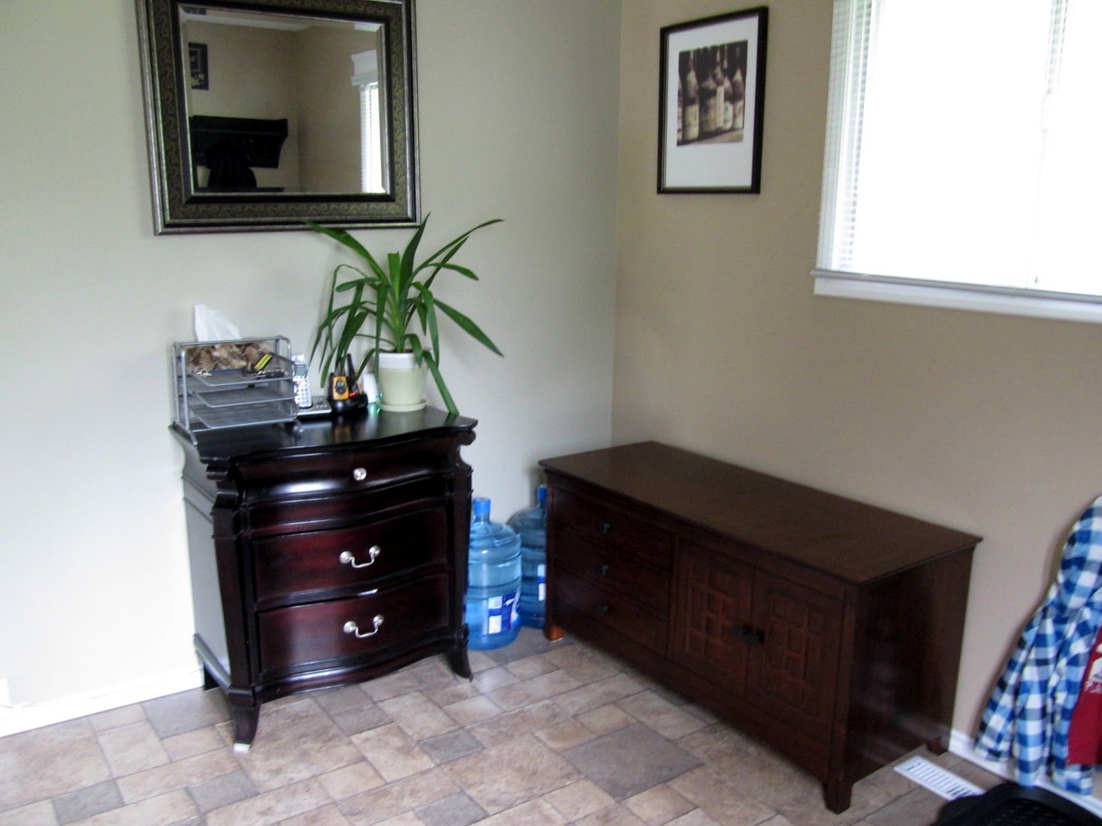 We stash our full and empty water bottles in the corner. This is one thing I would like to change/hide, I hate looking at them. But they are located in a handy spot, since the water dispenser in the kitchen is only a few steps away. The long chest is where we keep our firewood for our wood burning fireplaces. We keep the kids' hats, splash pants, mitts, and other items in the dresser under the mirror.