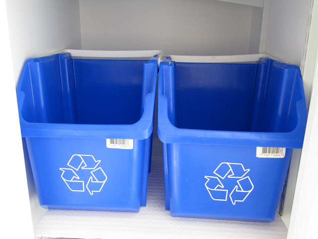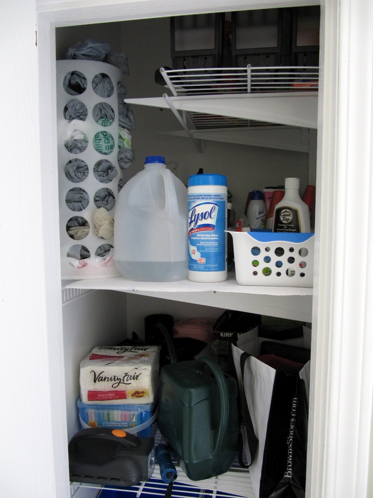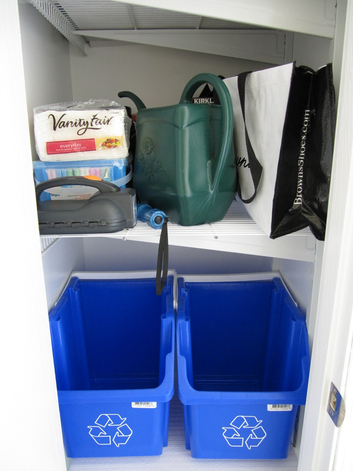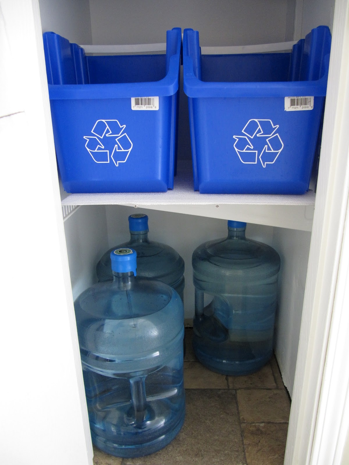 To my surprise, I can store 4 bottles of water at the bottom of the closet. (Why have I not thought of this sooner?!) My recycling bins were previously at the bottom and got moved up a shelf. The recycling bins are still within reach for my oldest son who likes to help recycle.