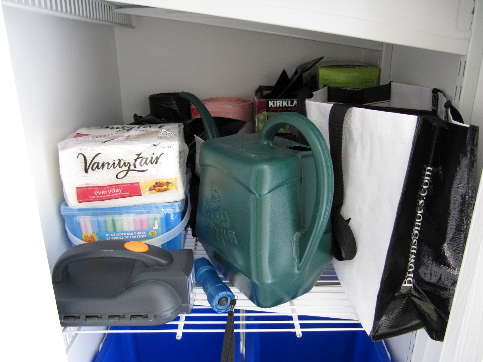 On the next shelf up from the recycling bins, we store our garbage bags, reusable shopping bags, watering can, and Swiffer cloths.