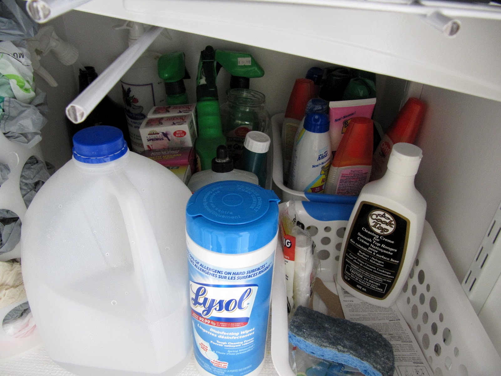 I keep my stove top cleaner and plant sprays and fertilizer on this high shelf. I also keep the sunscreen and bug spray on this shelf, close to the front door and easy to grab.